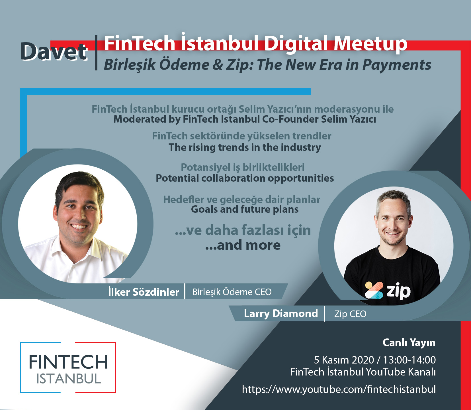 Birleşik Ödeme CEO’su İlker Sözdinler ve Zip CEO’su Larry Diamond katılımları ile FinTech sektöründe yükselen trendleri potansiyel iş birlikteliklerini, iki firmanın hedeflerini ve geleceğe dair planlarını ve çok daha fazlasını konuşacağız.