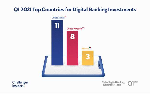 2021 yılının ilk çeyreğinde dünya genelinde en fazla dijital banka yatırımı sırasıyla ABD, İngiltere ve Meksika’da yapıldı. ABD’den 12 dijital banka, İngiltere’den 8 dijital banka ve Meksika’dan 3 banka en çok yatırım alan ülkeler arasına girdi. Toplam 42 dijital bankanın yatırım aldığı bu yılda toplan 3,7 milyar dolar yatırıma harcanmış oldu.