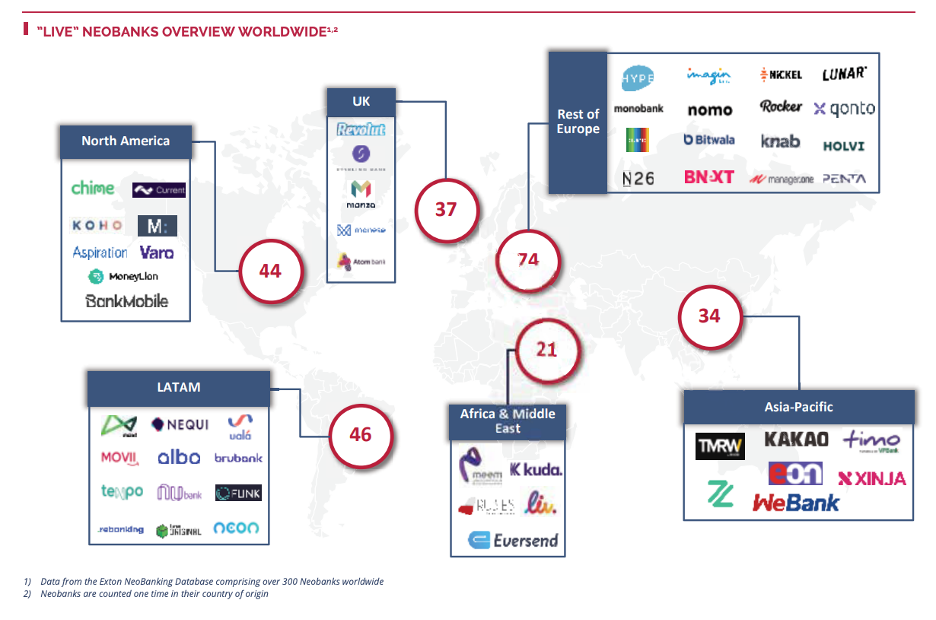 2010’dan bu yana, dünya çapında 310’dan fazla Neobank (yeni nesil bankacılık) şirketleri kuruldu ve dünya çapında tahmini 39 milyon kullanıcıya ulaşıldı. Avrupalı yönetim danışmanlığı firması Exton Consulting’in yayınladığı rapora göre, bugüne kadar kurulan 300’den fazla girişimden neredeyse yarısının (111) Avrupa’da bulunduğu açıklandı.