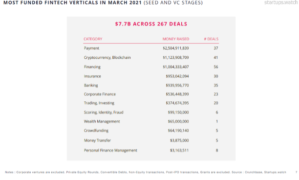 Rapora göre 2021’in mart ayında FinTech girişimleri 267 anlaşmayla toplamda 7,7 milyar dolar yatırım topladı. Mart ayının yatırım trendleri ödeme, kripto para birimi ve blokzinciri ve finansman oldu.