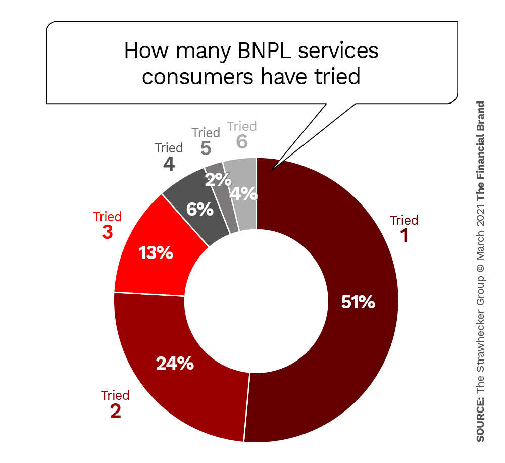 TSG araştırması, BNPL kullanıcılarının yaklaşık yarısının birden fazla hizmeti denediğini ve dörtte birinin üç veya daha fazla hizmeti denediğini gösteriyor.
