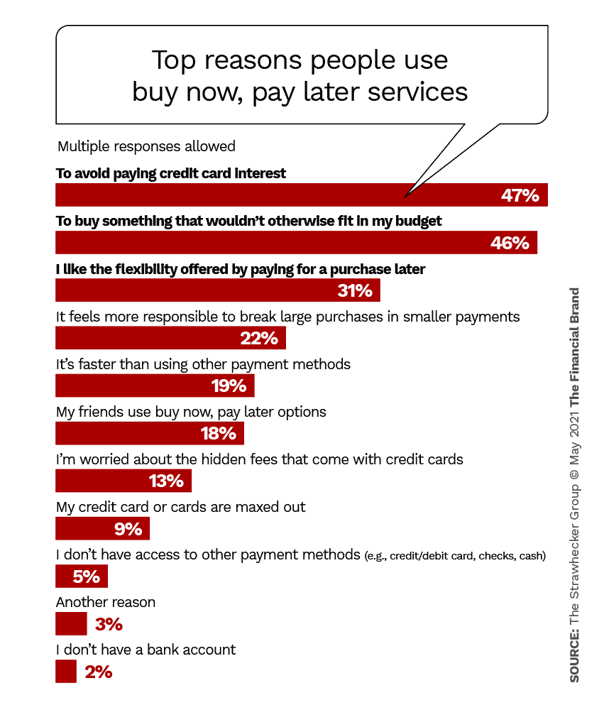 TSG’ye göre BNPL kullanımıyla ilgili yaygın anlatı, popülaritesinin temelde çok fazla parası olmayan ve kredi kartı kullanımını “reddeden” gençlerden kaynaklandığıdır. TSG, “Bu anlatı tamamen yanlış değil” diyor. Araştırması, BNPL’yi kullanmanın en büyük sebebinin kredi kartı faizinden kaçınmak olduğunu gösteriyor, neredeyse yarısı bunu söylüyor. Ancak aşağıdaki grafiğin gösterdiği gibi ortada sadece tek bir neden yok.