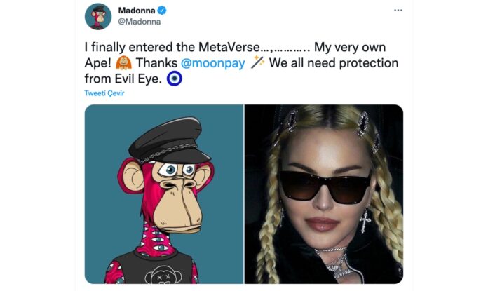 NFT dendiğinde akla ilk gelen koleksiyon haline dönüşen Bored Ape Yacht Club (BAYC) koleksiyonerleri arasında katılan Madonna’nın paylaşımında “Sonunda Metaverse’e giriş yaptım” ifadesi dikkat çekerken devamında Moonpay’e teşekkür ettiği ve “Hepimizin kem gözlerden korunması gerekiyor” ile paylaşımını sonlandırdığı görüldü.