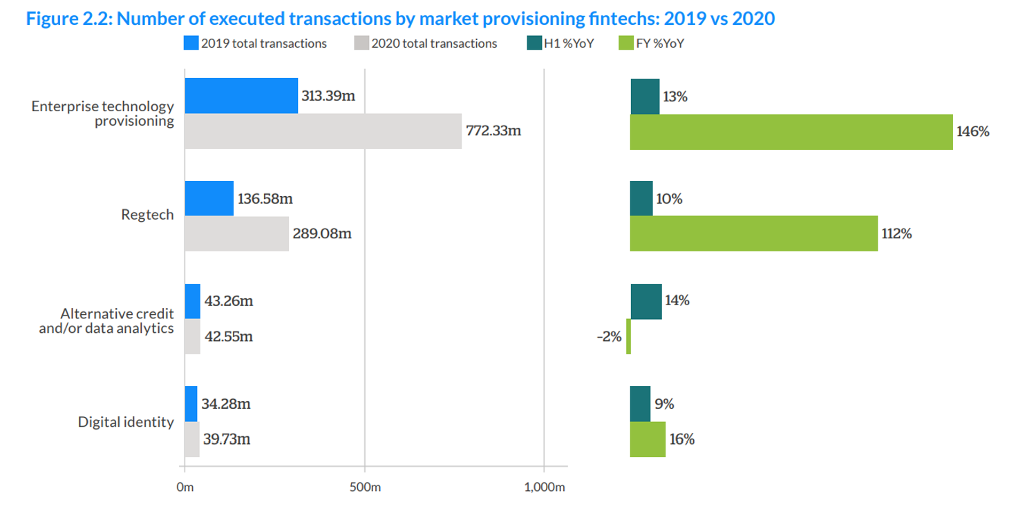 Perakendeye yönelik faaliyetlerin aksine hem aktivitelerin yoğunlaşması hem de işlem değeri noktasında EMDE’lerde “Market Provisioning” alanında faaliyet gösteren firmalar tarafından domine edilmektedir. Küresel olarak, girişim teknoloji tedariki (enterprise technology provision) ve RegTech faaliyetlerinin dikey anlamda ciddi orandan büyüdüğü ve en fazla işlem hacimine sahip olduğu belirtilmektedir. Diğer taraftan, dikey anlamda sadece alternatif kredi ve/veya veri analitiği faaliyetlerinin azalım gösterdiği, Rapid Assessment adlı çalışmada beklenenden daha kötü bir performans sergiledikleri ifade edilmektedir.